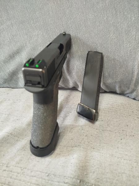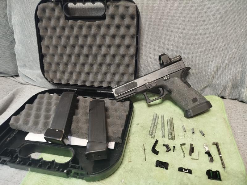 Tiene estás mejoras: punto rojo Vector Óptics de 3 Moas, 2 cargadores de 19 tiros, guia de retroceso de acero de Eemann Tech con muelles de 15 y 13 libras/fuerza. Muelles y desconector de competición, todas las piezas internas nuevas más las originales.+ De 350 Euros en mejoras.