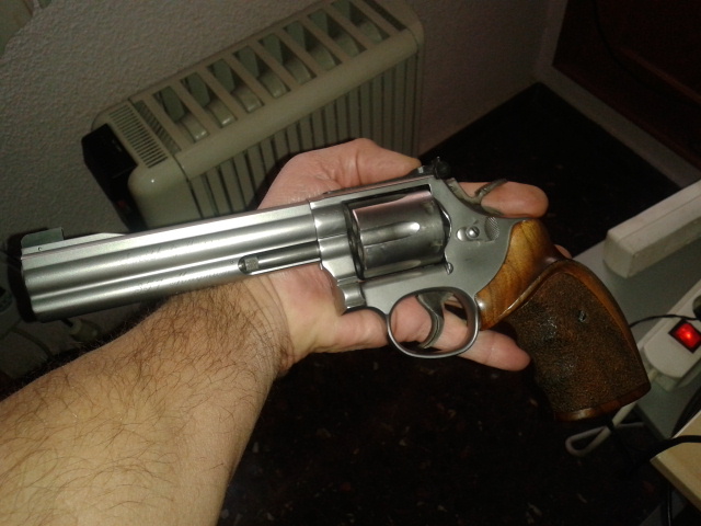Hola; mi nombre es Alfonso María y vivo en Murcia. Vendo tres armas por temas personales (Divorcio). No es el primer arma que vendo por este foro y nunca he tenido la mas mínima critica. A mi edad ya no se hacen esas cosas de estafas. El revolver esta impecable. Como antes te comentaba sus recamaras están perfectas. Ya sabes que es corriente intentar vender revólveres con alguna recámara dilatada por recargas mal hechas y pasadas de carga. El punto de mira es el de competición y el alza no tiene ningún golpe. En Conjunto el arma esta impecable. Lleva las cacha de fábrica, una Nill americanas semi anatómicas que también están perfectas. En conjunto todo esta como nuevo.
