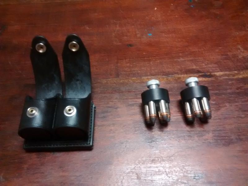 Dos cargadores rápidos HKS, especiales para este modelo de revolver. También el porta cargadores para la cintura.