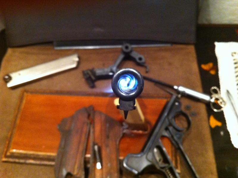 En las fotografías que adjunto (no son lo mas brillante) explico detalladamente cada particularidad de la venerable pistola que este año ha cumplido un siglo pero que esta ajustada y funciona como si la hubieran hecho ayer.