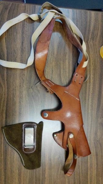 Caja original ,dos juegos de cachas de madera(pequeñas y grandes),funda de cuero sobaquera basculante y una funda interior.