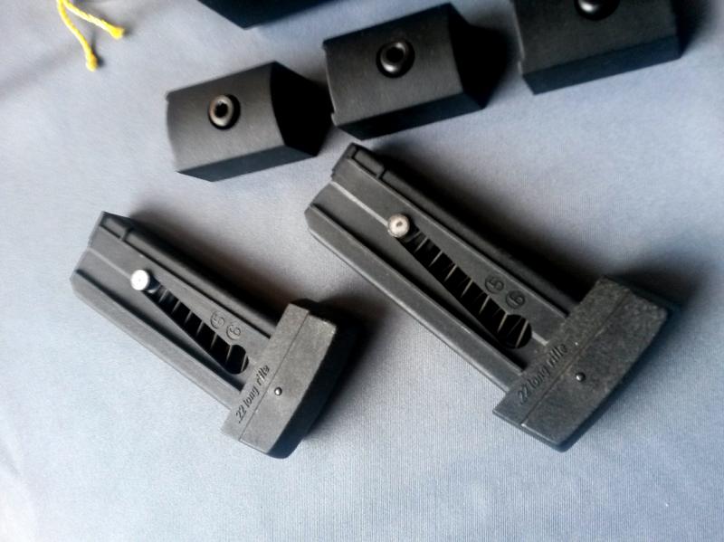 Entrego el arma con cuatro cargadores del cal. 32 (dos de ellos sin uso), dos cargadores del cal.22, tres contrapesos de origen, tres simuladores de contrapeso en plástico, ayuda de carga, un contrapeso adicional y construido en CNC expresamente para el modelo, para usarlo con el carro del .22 en las modalidades de velocidad o standard, cuyo peso es de 385gr. Bolsita de origen con todas las herramientas de ajuste y los correspondientes blancos de prueba de cada calibre.