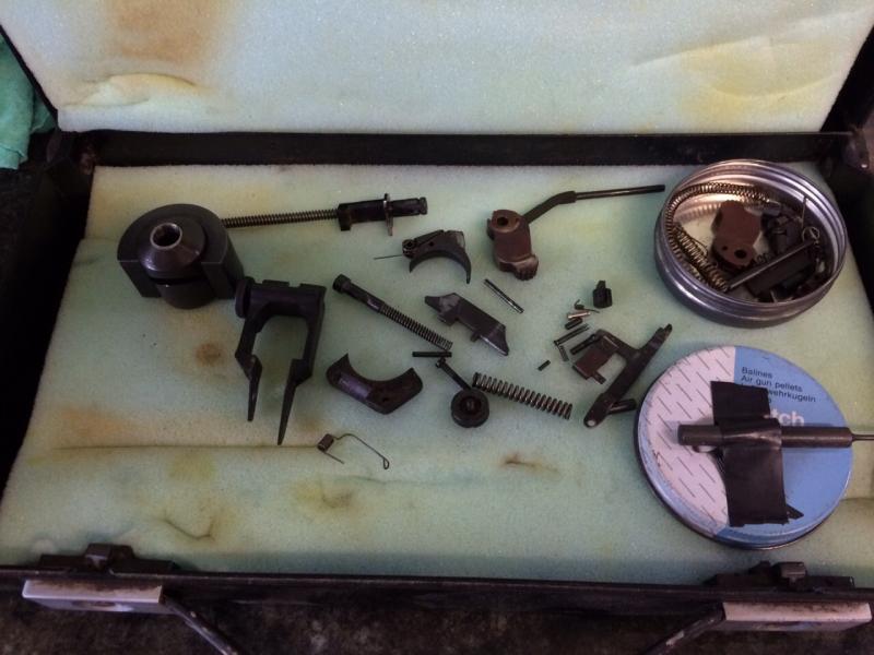 muelles y pasadores, conjunto completo de disparo gatillo incluido, dos agujas percutoras, pieza completa del alza, contrapeso freno de boca roscado que no sirve para este modelo concreto porque no tiene la punta roscada.