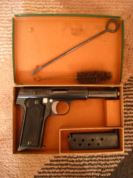 Conserva su pavón original y se encuentra en un estado excepcional. Calibre 9 Largo. Cachas de pasta negra con líneas verticales al estilo de las Tokarev con las iniciales RE. La pistola está completa tal y como salió de fábrica, conserva sus dos cargadores, baqueta y feminela, todo ello contenido en su caja de cartón. Está guiada en F