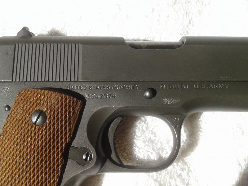 GRB escribió:Vendo pistola Colt 1911, Cal. 45 ACP (año 1943). Tiene el acabado original US Army en parkerizado marrón. tiene funda y funciona perfectamente, no ha interrumpido tiro nunca. Precio 1200 €.