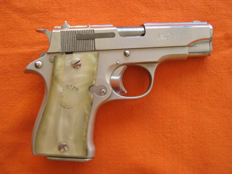 SE VENDE PISTOLA "STAR", mod. "DK", cal. 9 CORTO, , acabado totalmente cromado en corredera y piezas pequeñas y de accionamiento, armazón de aluminio anodizado en gris níquel, original de fábrica, cachas originales de perlita con fileteado del logotipo, modelo de la foto especial del que se fabricaron muy pocas unidades y bajo pedido, en perfecto estado, con dos cargadores (uno pavón negro), Guiable en Licencia A ó B. Atiendo Whatsapp: 699617325 - PRECIO: 100€ (+ 25 gastos envio si es fuera de Zaragoza).