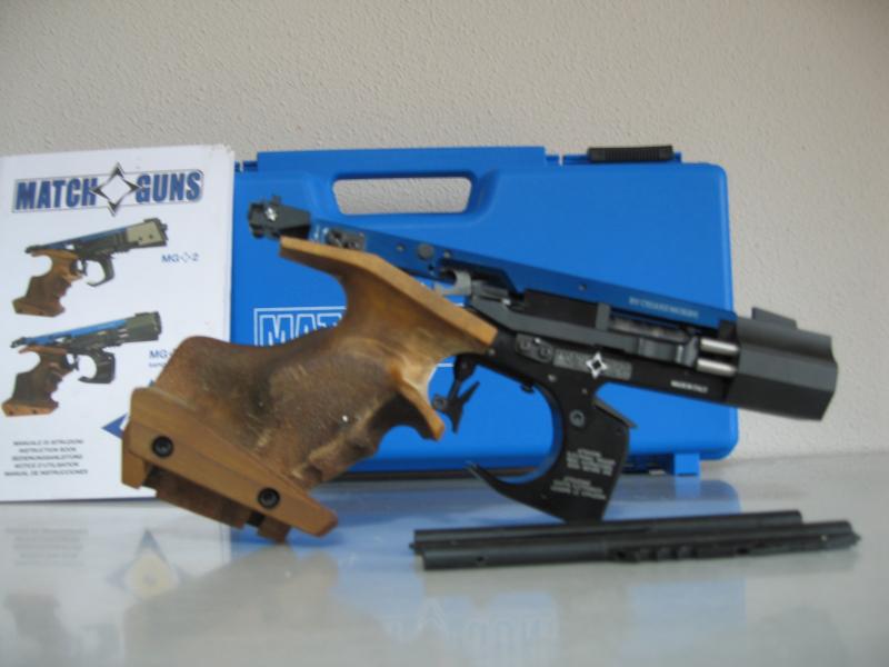 Pistola MATCH GUNS MG2E ELECTRONICA, calibre 22 LR, en muy buen estado y un solo dueño, con su caja original e instrucciones de uso, 2 cargadores. Cacha talla M