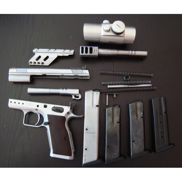 Vendo tanfoglio gold custom 38 sa, tiene 2 cañones uno 9mm y otro 38sa, 3 cargadores estándar y uno de 25, varios muelles, freno de boca y visor punto rojo. La vendo porque no me adapto a ella. Barcelona. 700eu. La rebajo a 650 y si se recoge en mano pago el cambio de nombre.