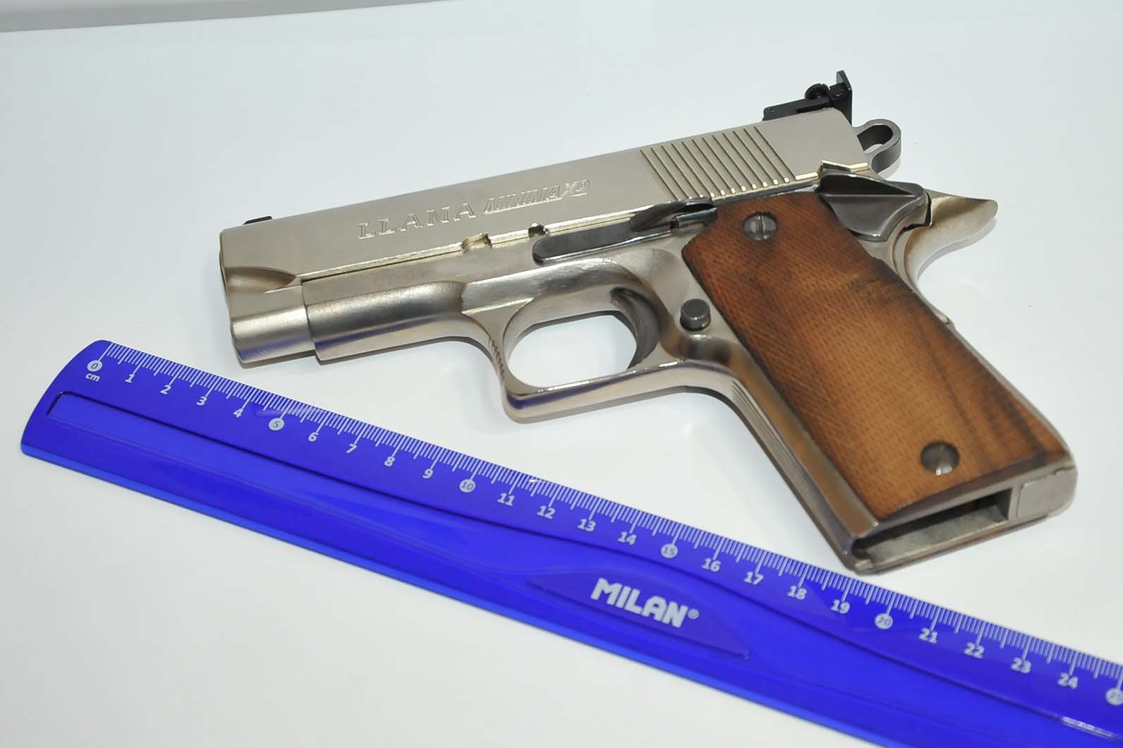 Vendo por necesitar hueco el la licencia, Llama MiniMax 9 pb con tres cargadores y dos juegos de cachas en madera unas con picado (las que lleva puestas) y otras lisas ademas de las originales de goma. El arma la compre hace unos tres años a un compañero del foro y la verdad es que solo he tirado una vez con ella, como se ve en las fotografías no tiene el alza original, la cambiaron en su día por una LPA ajustable, seguramente para que diese las medidas, esta guiada en F.