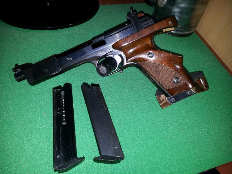cañon de 6", punto de mira y alza regulables, este modelo dispone de palanca de retenida para dejar la corredera abierta. Se incluye 2 cargadores, cachas originales de baquelita, cachas semi anatomicas de madera originales, contrapeso en la punta del cañon para darle mejor equilibrio y maletin original de transporte. Si esta arma ya de por si es indestructible se incluye algo de recambio para toda la vida.