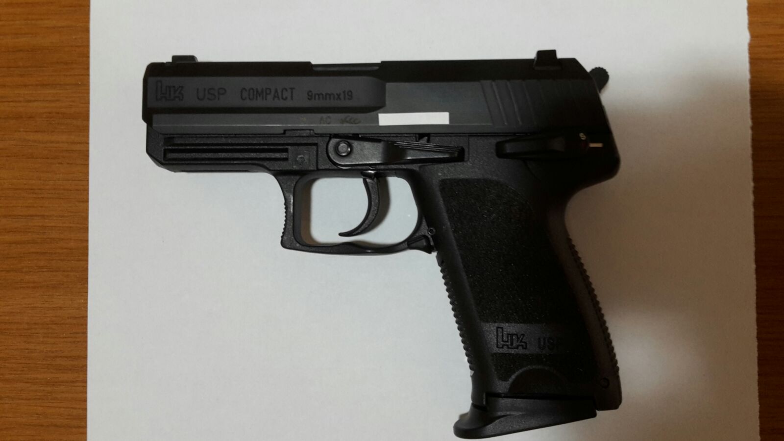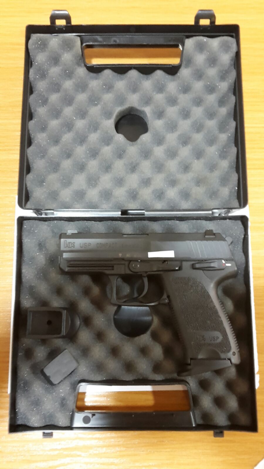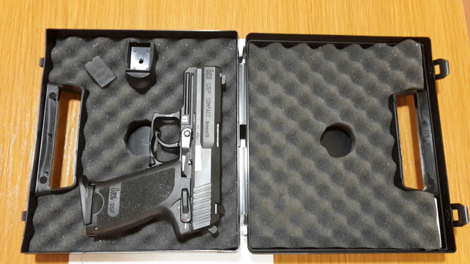 En venta pistola HK USP Compact calibre 9 pb. Va con todo lo que aparece en las fotos, incluido las tres terminaciones posibles para el cargador : el talón plano, el de apoyo para meñique y el de +2 (para aumentar capacidad en dos cartuchos más).