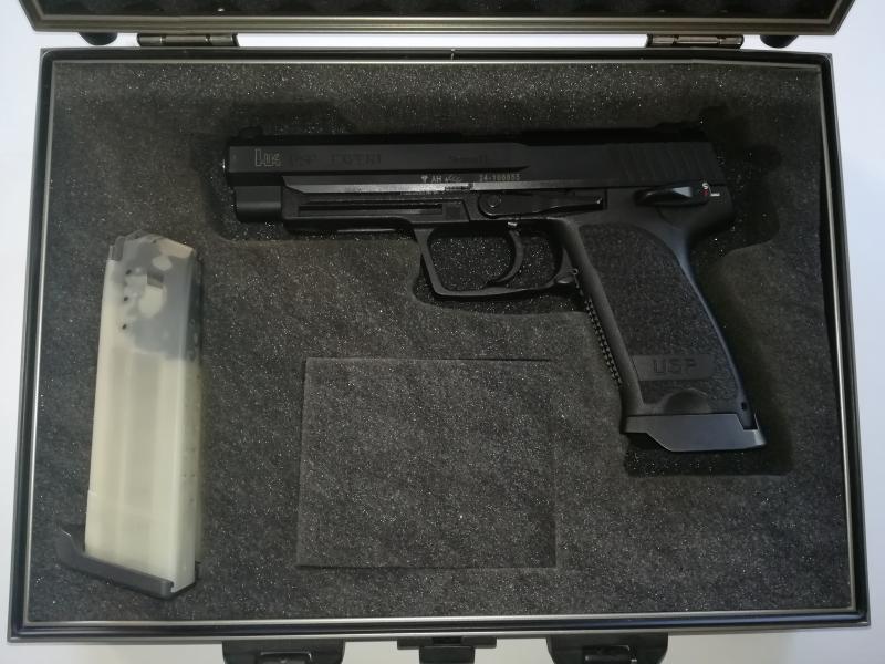 Mi compañero del club, Joan, vende esta pistola HK USP EXPERT del 9 mm Parabellum, con dos cargadores orginales de 19 balas y caja metálica original de HK