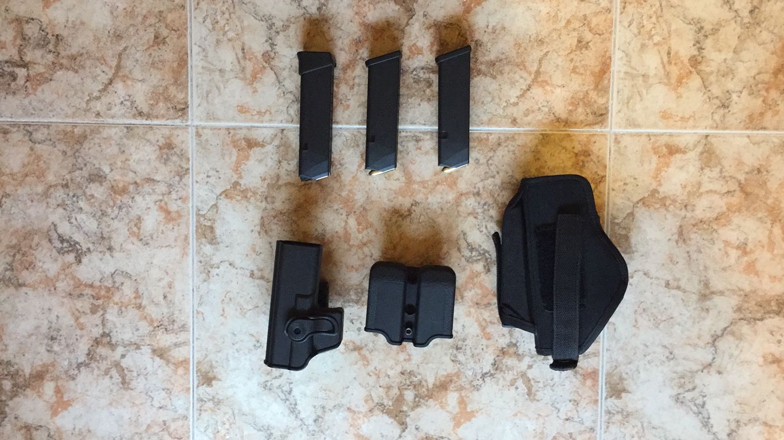 El arma se entrega con 3 cargadores (dos cargadores de 17 y 1 de 19), funda de extracción rápida de la marca blackhawk, portacargador doble de la marta IMI DEFENSE y funda de tela.