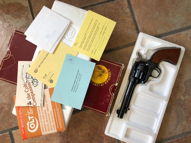VENDO este precioso Revolver Colt Single Action Army (Acabado ROYAL BLUE) de 5'5 pulgadas en calibre 45 LC....SEMINUEVO. Se trata de una edición conmemorativa del Black Powder Frame, pero solo en cuanto a diseño y acabados, ya que los punzones indican que esta fabricado para usar con polvora nitro, fabricado en 1.988.