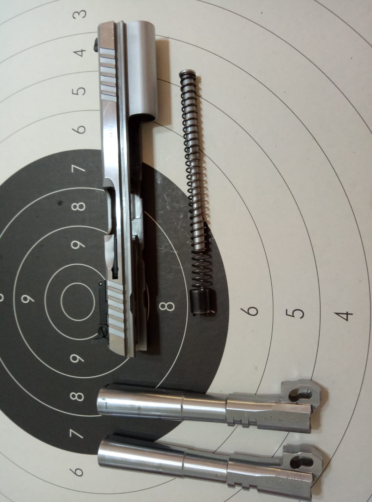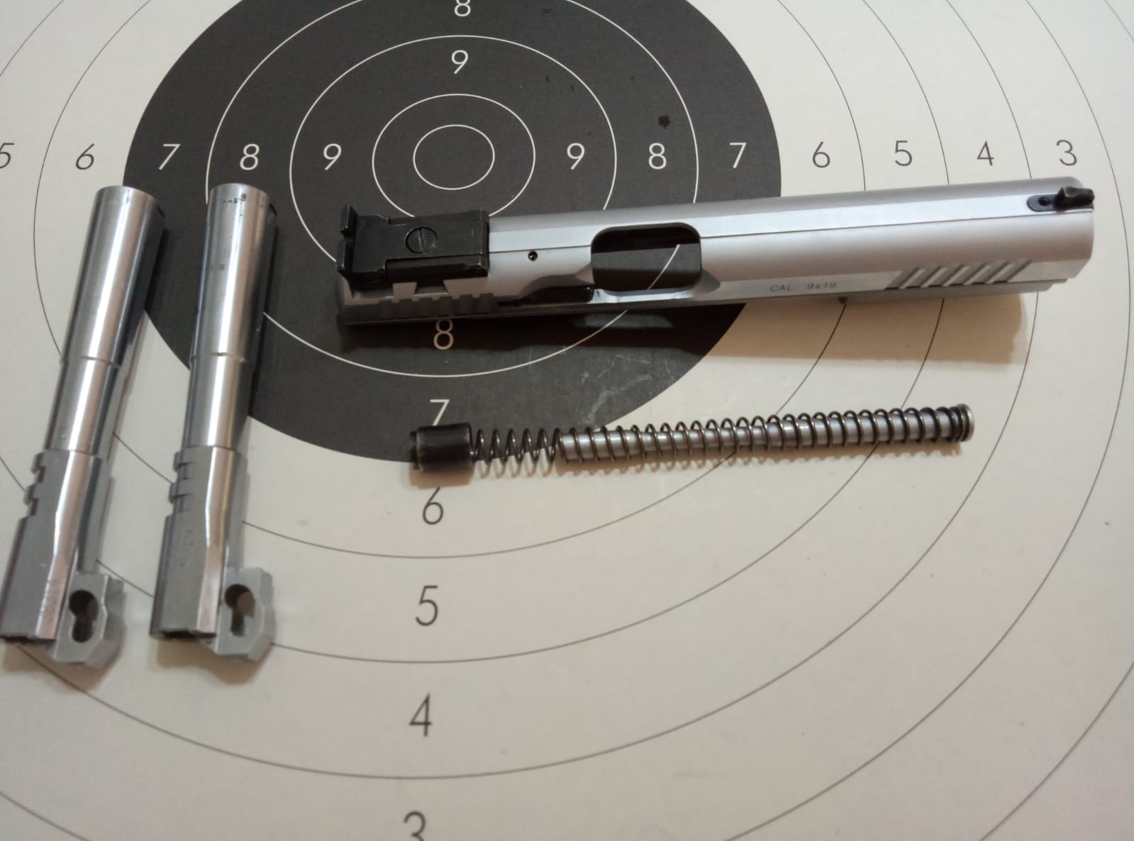 Tiene 2 cañones del 9mm, se compro uno nuevo para precisión y el viejo que traía el arma creo que se usaba para recorridos. Tiene 2 cargadores y maletín original.