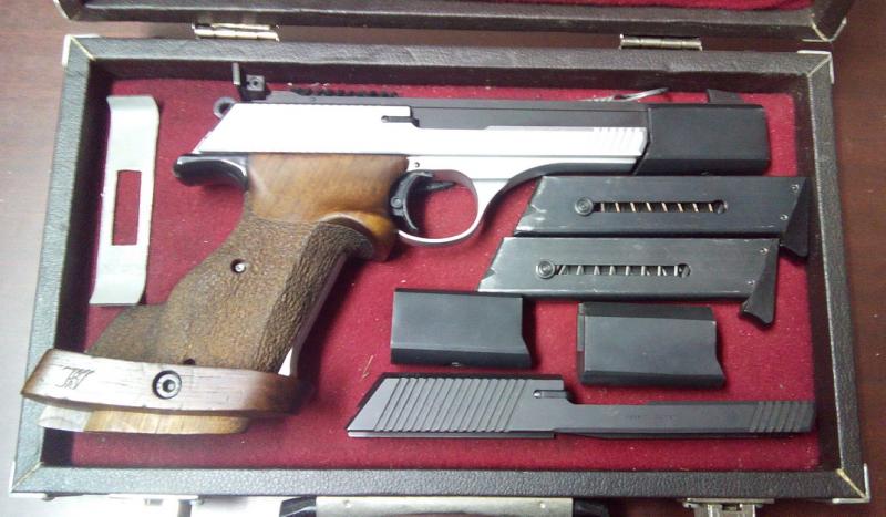 Vendo estupenda pistola alemana, en muy buen estado, marca ERMA cal 32, con dos cargadores, dos contra-pesos, dos correderas, una negra y otra gris plata, cacha anatomica regulable, marca Knill, maletin de transporte.
