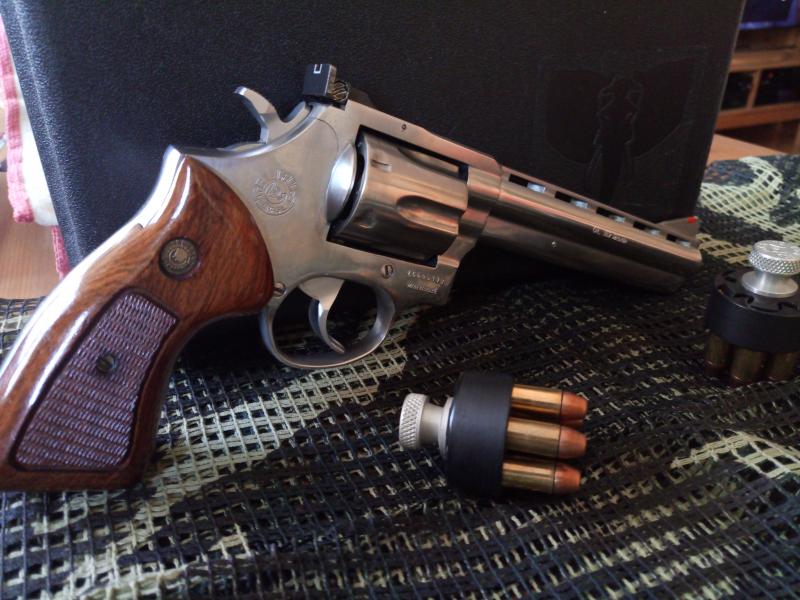 Con el revólver se adjunta maletín, funda de cordura, canana porta cartuchos, cachas originales, cachas Pachmayr de goma y dos cargadores rápidos con sus correspondientes portacargadores.