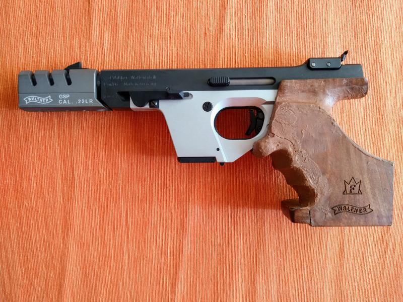 pistola Walther GSP Expert del calibre 22 Lr, poco uso y muy cuidada. Cacha talla M, retocada con pasta de madera para hacerla Talla L como se puede apreciar en las fotos. Se puede quitar si se quiere. Maletin, libro de instrucciones, herramientas, 2 cargadores, dos tablillas , todo original.