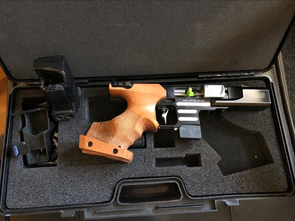 Se vende pardini hp 32 calibre 32 S&W Wadcutter, la pistola viene con maletín original, dos cazavainas y dos cargadores, llaves y baqueta original, el arma está en Zaragoza y el precio son 800€.