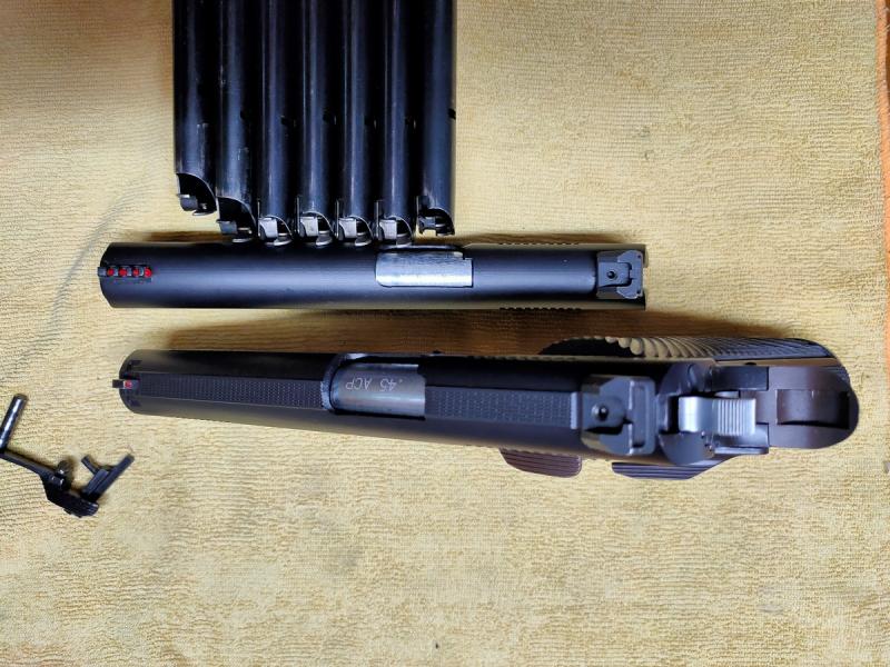 Hola, vendo Norinco 1911 A1 con dos carros , de 9mm y 45 ACP , con 5 cargadores de 9mm y 2 del 45 , con muchos extras, muelles Wilson combat , fannel , retenida cargador sobredimensionada, cachas de g10 mas otras de madera, martillo sps, guía de la corredera corta, busihng del 45 en inox, housing del muelle real nuevo y todo lo que se ve , se pavonó hace 3 años en negro mate, en principio era un proyecto para tirar en classic de ipsc y ahí se quedó el tema , no he tirado más de 300 cartuchos con ella , la vendo por cambio de proyecto y pido 450 Euros por todo , se puede ver y probar (para cuando se pueda )en la provincia de Barcelona, guiada en F