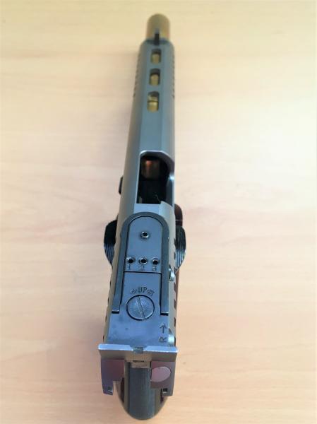 Como se puede comprobar en las fotos, su estado es EXCELENTE, y funciona PERFECTAMENTE, ademas, se ha customizado en Ceferino Massip, para quitarle peso y hacerla mas precisa, actuaciones tales como: aplicación nitruro de titanio sobre el cañon y la corredera, se le ha hecho "branquias" en la parte lateral y superior de la corredera, se le quiró el fanel de la empuñadura, se le ha cromado en negro el armazon etc.