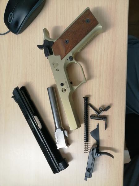 la pistola tiene un cargador extra (tres en total), el muelle de la corredera que lleva puesto esta recortado para tirar munición recargada, pero entrego uno nuevo, y una base de aluminio +2 original Pardini.