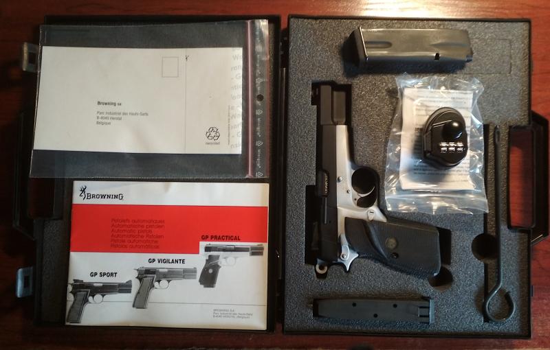 Pistola Browning GP Practical del 9mm con poquísimos tiros. La compré nueva hace cuatro años por 975 € y la vendo por menos de la mitad, por 400 €. La he utilizado muy pocas veces y está impecable, pues me he dedicado al tiro de precisión con el 22.