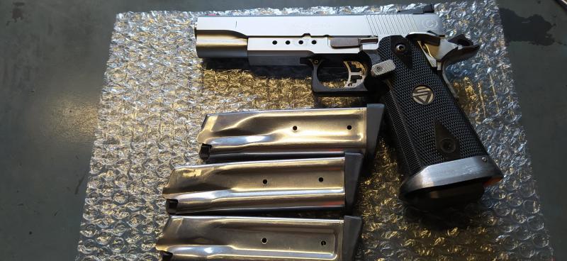 El armazón y piezas interiores son SVI INFINITY, la corredera CASPIAN y monta un cañón pesado con rampa de la casa SCHUEMANN ULTIMATCH.
