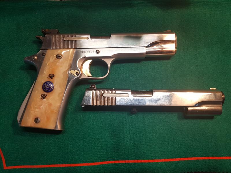 Nunca se fabricaron Star A, B, M, o P, las tipo 1911 en acero inoxidable, solo en acero al carbono.....de aquellas, no había la tecnología metalúrgica actual, y suficiente para fabricar un acero inoxidable de calidad para aguantar las presiones de disparo un arma de grueso calibre. Aun tardo bastante Star en fabricar armas inox, como la Firestar.