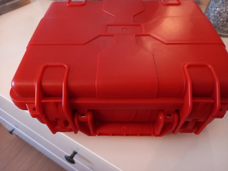 Lleva un maletin a juego, rojo, chulisimo totalmente nuevo, tiene perforados a medida los huecos. El maletín es de estos que se cierran herméticos y no le entra ni aire ni agua, una maravilla