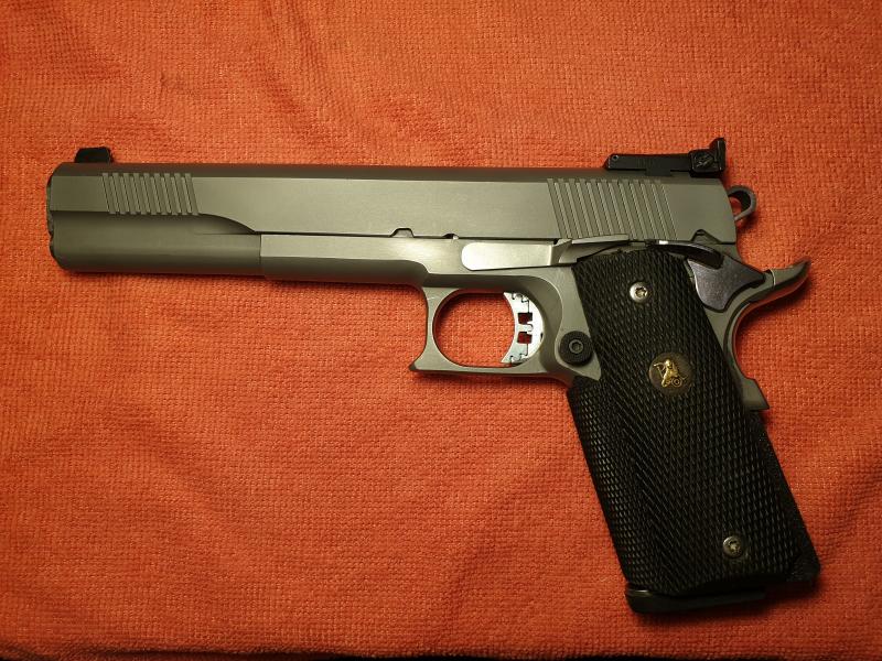 Muy a pesar mio vendo esta magnifica arma de precision pura, ni que decir tiene los que ya la conoceis. Va con 2 carros, en calibre 9mm..mismo color que el armazon y 45 ACP., este en pavonado negro pulido, disparador Infinity. Se puede ver y probar en Canto Blanco (MADRID). El precio es de 1.750 eur. Mas informacion y fotos, contesto por privado.