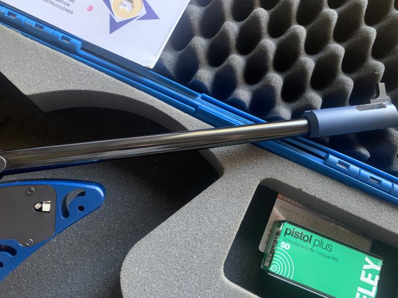 Está revisada, con pila nueva y limpia de restos de plomo en la bocacha, que se suelen quedar con el tiempo. Se encara muy bien y es muy precisa. El pavón está en muy buen estado.