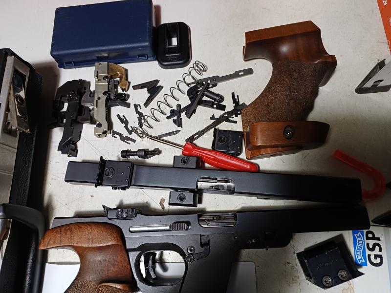 Dos canchas varios cargadores dé cada calibre, tres disparadores, estuche original, alza de repuesto, varias hojas del alza y puntos de distinto grosor, pequeñas piezas de repuesto.....