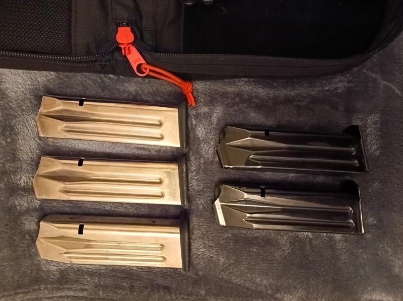 5 cargadores, 3 originales y 2 marca Mec-gar, todos funcionan perfectamente, con capacidad de 18 cartuchos.