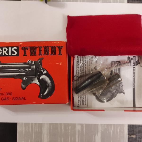 4- Derringer Noris Twinny, calibre 380 revolver, acabado envejecido, con su cajita, manual y bocachas lanza bengalas 250€