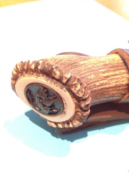 Una foto detallada del macizo cabo de ASTA DE CIERVO terminado en medallón de BRONCE:
