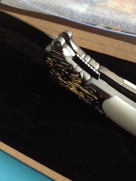 Navaja en su caja: 8,5 cm de hoja, 20 cm longitud total abierta.