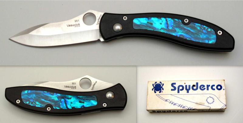 Navaja Spyderco de edición limitada y numerada (#951). Es una versión del diseño Vesuvius de Frank Centofante que en esta ocasión cuenta con una incrustación de nácar azul en la cacha y la hoja es de acero ATS-34.