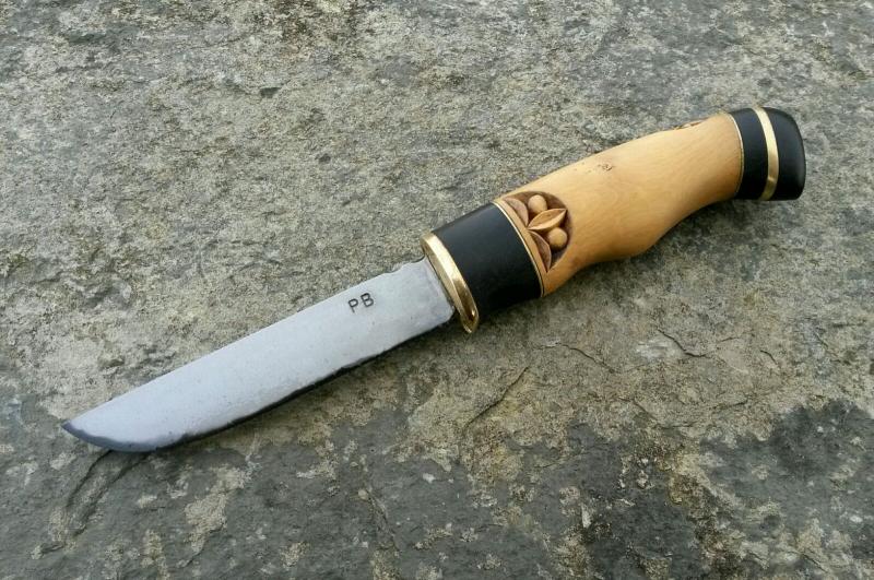 Cuchillo estilo nordico de boj y ebano con acero blue paper y tallado por Javier Lopez, 180 euros con envio incluido
