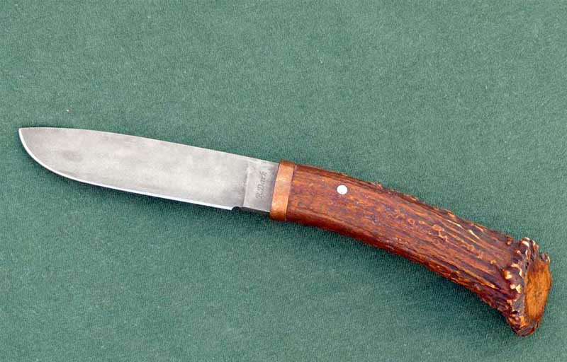 Hoja forjada a mano de acero al carbono 1084, este acero es el preferido por muchos maestros cuchilleros debido a que cuando es forjado y sometido a un tratamiento térmico adecuado, produce hojas de gran calidad con filos agudos y de gran tenacidad. El proceso químico de envejecimiento añade a la hoja un toque especial y la protege de manchas y óxido. Mango de la cuerna y roseta de un ciervo “cola blanca”, seleccionado por su belleza y relieve, sujeto a la espiga con un pasador de acero inoxidable y una virola/espaciador de cobre. Funda de cuero de gran calidad, hecha a medida, tipo petaca , que envuelve y protege la mayor parte del cuchillo.