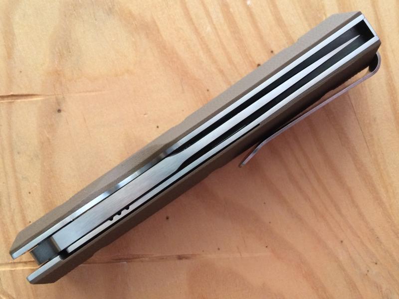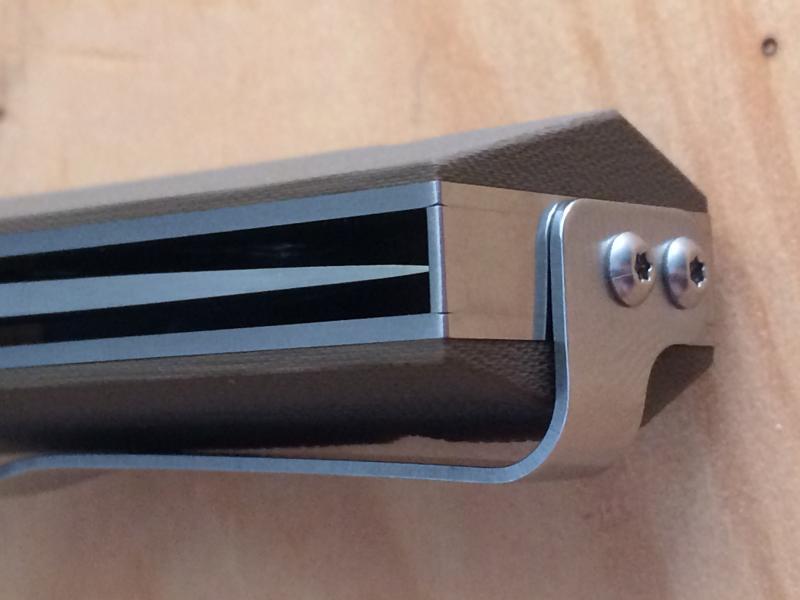 La hoja mide 89 mm.de longitud y tiene una sección de 4,5 mm. y esta fabricada en acero S 30 V . El mango tiene forros de acero aligerados y cachas de G-10 de color marrón (coyote brown según el fabricante) texturizados y sección romboidal, que le proporciona un tacto y un agarre excepcional.