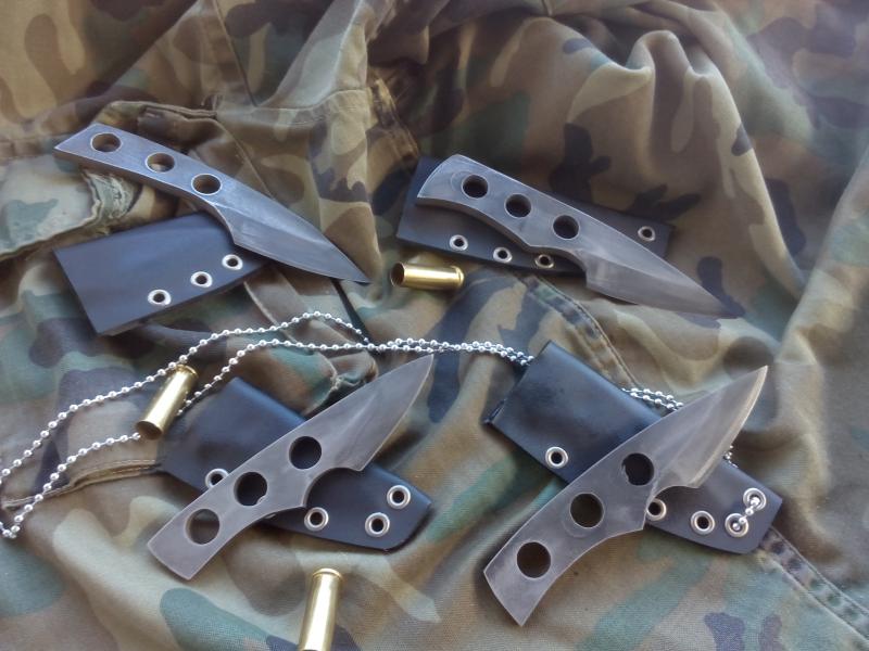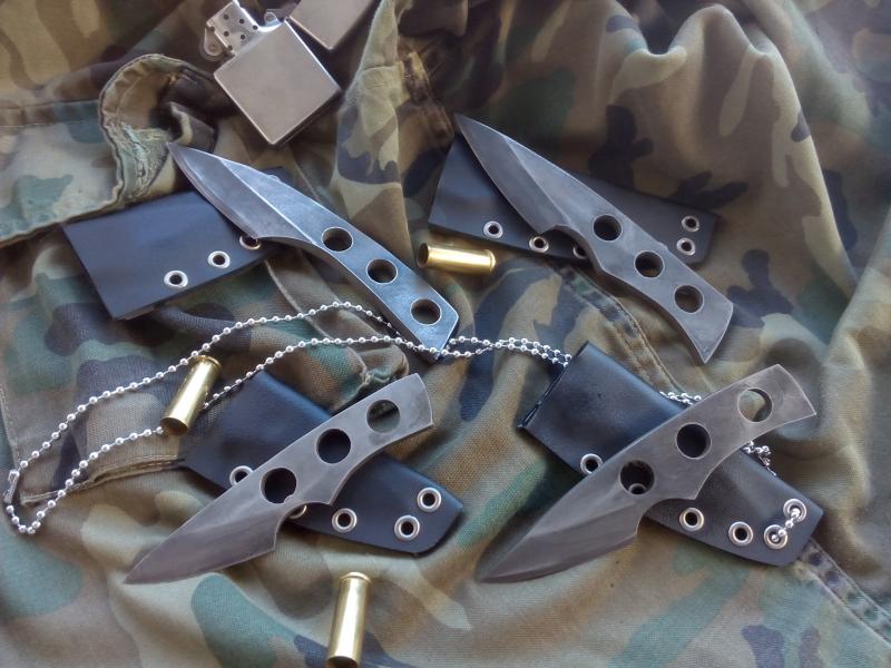 Todos son de acero 1095, temple diferencial con hamon, acabado al ácido.