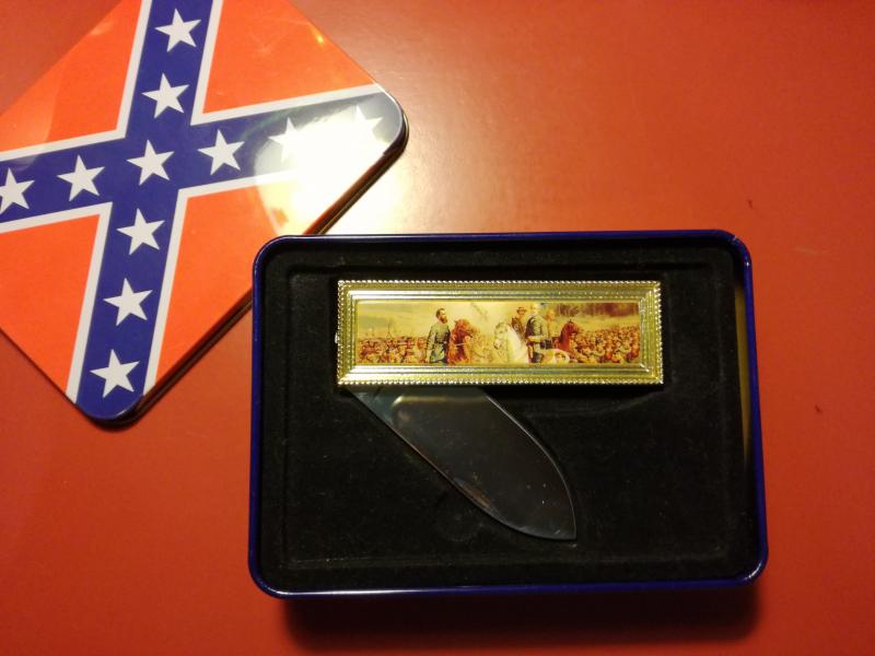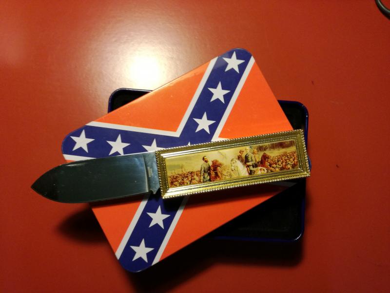 Vendo navaja con motivos de la Confederación en el mango. Presentada en caja tipo lata, con bandera confederada. Totalmente nueva.
