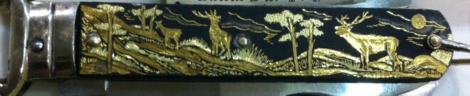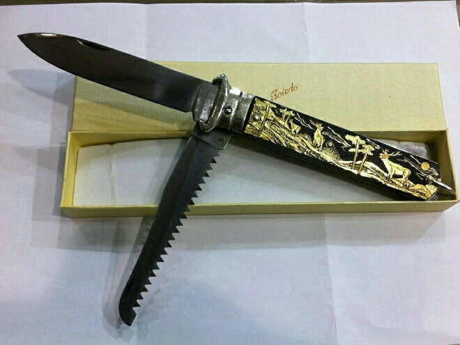 Se pone en venta está navaja Aitor años 80, completamente grabada en oro de 24 kilates, trabajo puramente artesanal con escenas de caza.