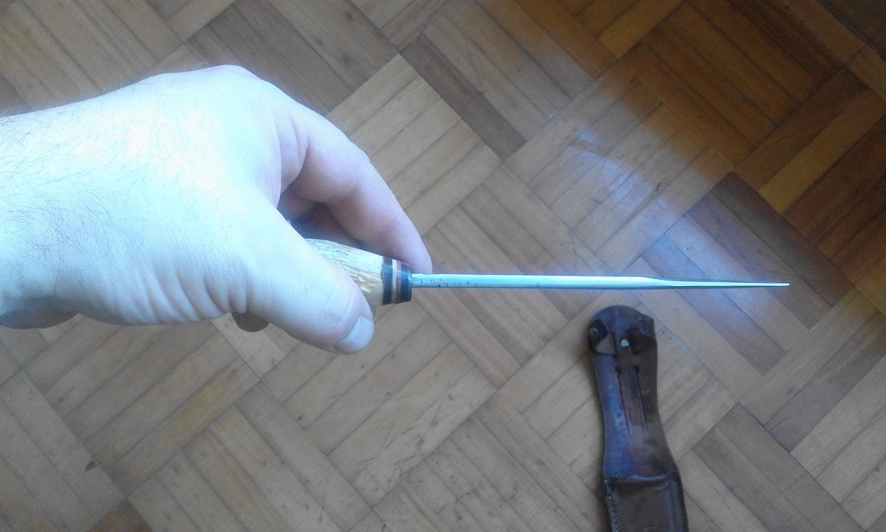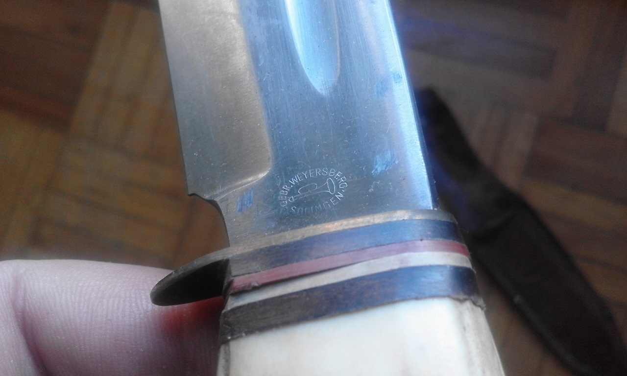 El cuchillo tiene el mango de asta de ciervo, es de la marca GEBR. WEYERSBERG SOLIMGEN, debe tener unos cuarenta años, la funda esta algo deteriorada por el tiempo, pero es la original. Precio 50 euros mas portes o cambio por navaja Spyderco.