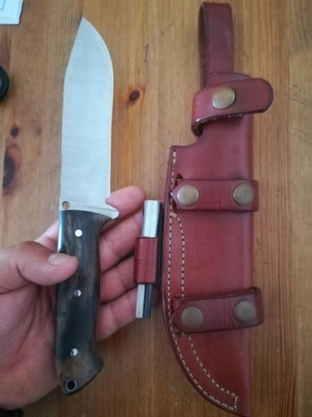 Cuchillo artesanal de Manuel de la torre acero inox largo de hoja 15 cm , mango 12 cm en ébano exótico , grosor 5 mm y vestido con funda de José quercus su precio 100 envío incluido