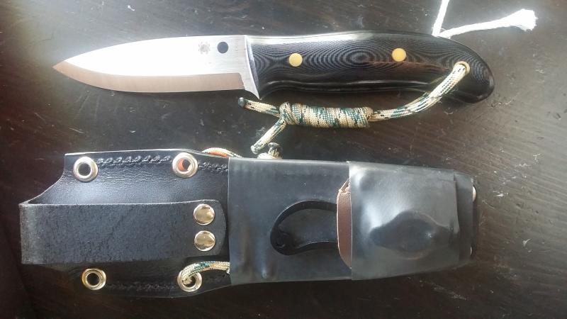 Cuchillo de supervivencia de la famosa marca SPYDERCO, modelo bushcraft UK. Acero 01 tool steel (alto acero carbono), cachas en micarta negra, increiblemente comodas. Incluye la funda original de piel negra con refuerzo interno de plastico a la que se le han añadido los siguientes accesorios: un encendedor de magnesio, un pedernal, una brujula, una linterna de llavero y una hoja secundaria de acero carbono. Tambien se incluye la caja original.