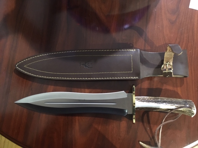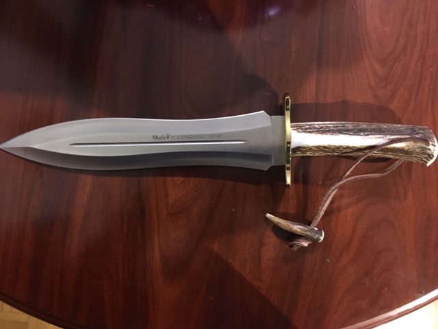 Cuchillo de Remate MUELA PODENQERO: Acero X50rMoV10 molibdeno vanadio. Dureza del acero 57,58 HRC. Forma de la hoja: Punta de lanza doble filo, Daga. Puño: Asta de ciervo. Funda de cuero marrón con el logo de Muela. Estructura del cuchillo; enterizo. Longitud de la Hoja 26cm. Mango 12cm. Longitud total 39.5cm. Peso: 630gm. Fabricado en España.