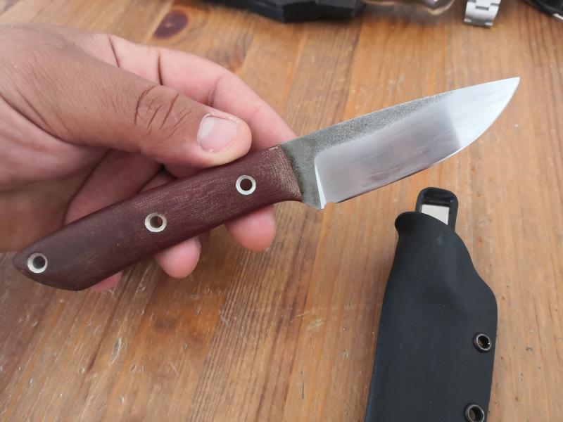 Cuchillo realizado en acero N690 muy pequeño y ligero micarta marrón un 7 cm de hoja y 3 mm de espesor incluye una funda de kydex hecha a medida su precio 70 envío incluido