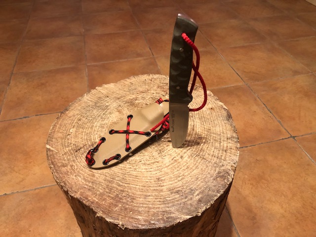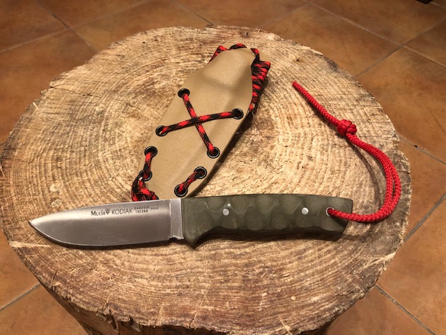 Vendo cuchillo Muela Kodiak en acero 14c28n y cachas en micarta verde. Funda de kydex clor arena con paracord y cordón fiador.